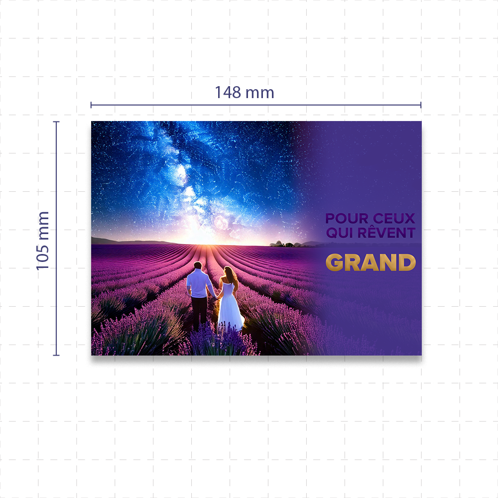 Créez des cartes postales 14,8 x 10,5 cm pour envoyer des vœux, invitations ou messages uniques. Offrez une touche de personnalisation avec des finitions qui attirent l’attention : une dorure élégante pour sublimer votre design ou un pelliculage brillant pour faire ressortir vos images.
