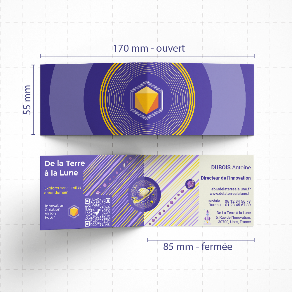 Optez pour des cartes de visite 17 x 5,5 cm avec 2 volets, idéales pour présenter des informations supplémentaires. Ce design unique, associé à des finitions comme un relief discret ou un pelliculage soyeux, apporte une touche sophistiquée et impactante. Vos cartes de visite deviennent des supports qui marquent durablement les esprits, tout en reflétant la modernité et le professionnalisme de votre image.