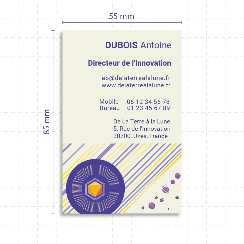 Offrez des cartes de visite personnalisées 8,5 x 5,5 cm en orientation portrait pour un design élégant et pratique, parfait pour vous démarquer. Grâce à des finishes haut de gamme comme un vernis 3D ou une dorure discrète, vous valorisez vos échanges professionnels avec une carte qui capte l'attention. Ces options de personnalisation transforment une carte classique en une véritable signature professionnelle.