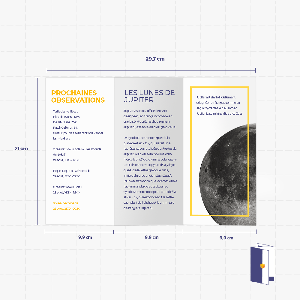 Avec un format ouvert de 29,7 x 21 cm, ce dépliant 3 volets offre un espace généreux pour présenter votre message de manière claire et complète. L'espace disponible vous permet d'inclure du texte, des images et des graphiques de manière équilibrée, afin de créer un dépliant informatif et visuellement attrayant.