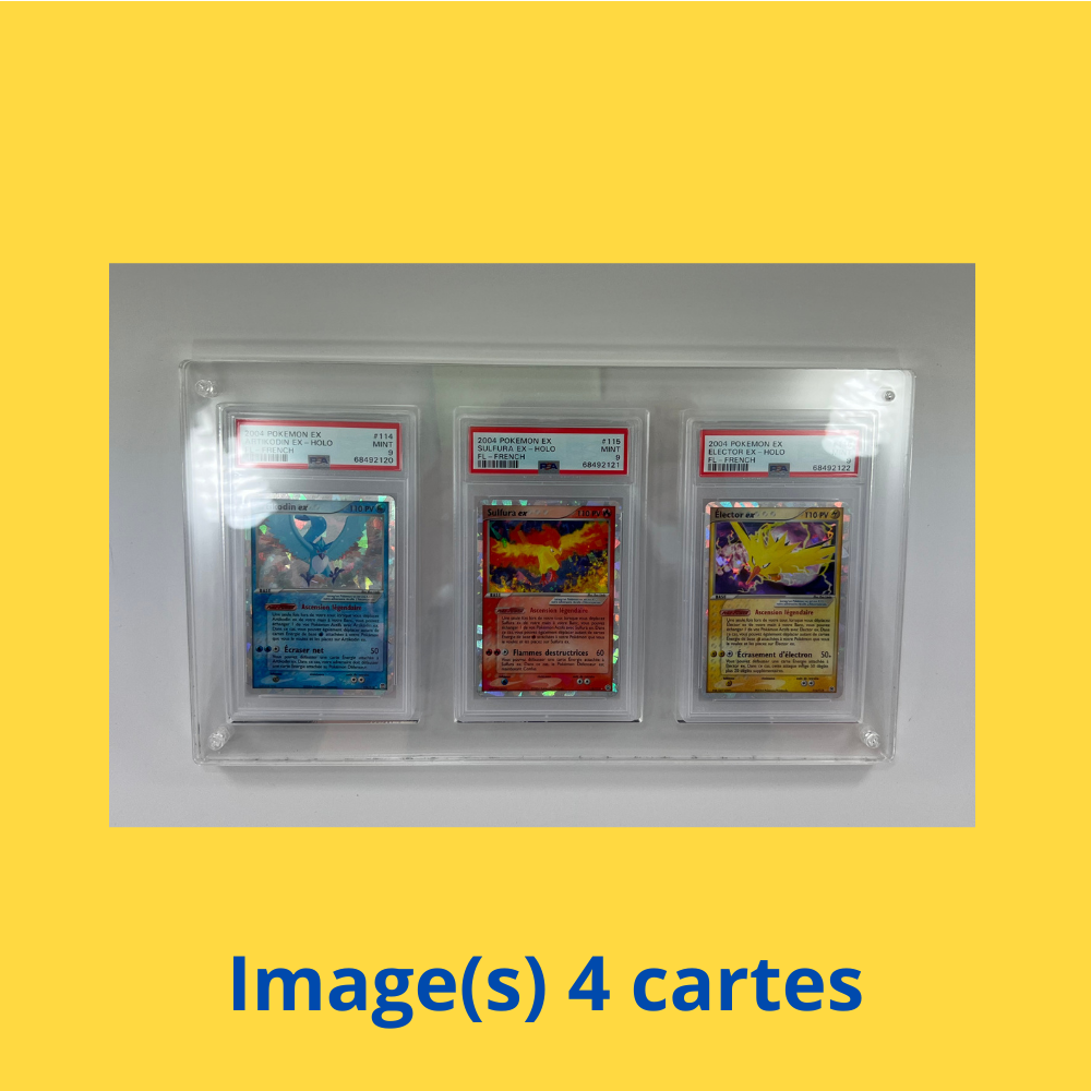 Cette protection acrylique vissée pour quatre cartes gradées permet une présentation majestueuse de vos pièces les plus précieuses. Résistante, stable et parfaitement transparente, elle met en valeur vos cartes tout en les protégeant durablement. Le système vissé garantit une inviolabilité totale.