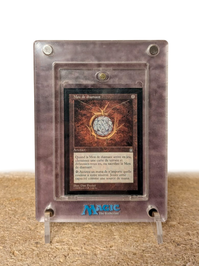 Positionnez votre carte porte-carte dans l’emplacement réalisé à cet effet, fermez le capot en vous laissant guider par l’attraction des aimants et exposez ou stockez en toute sécurité.